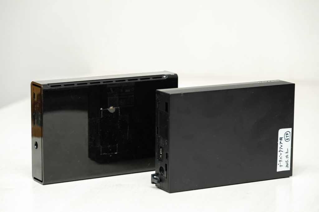 HDDについては、いろいろなメーカーの商品を使った中で、BUFFALO製品が一番動作が安定していると感じます。昔に比べて小型で静かに(写真右)、そして安くなりました。
