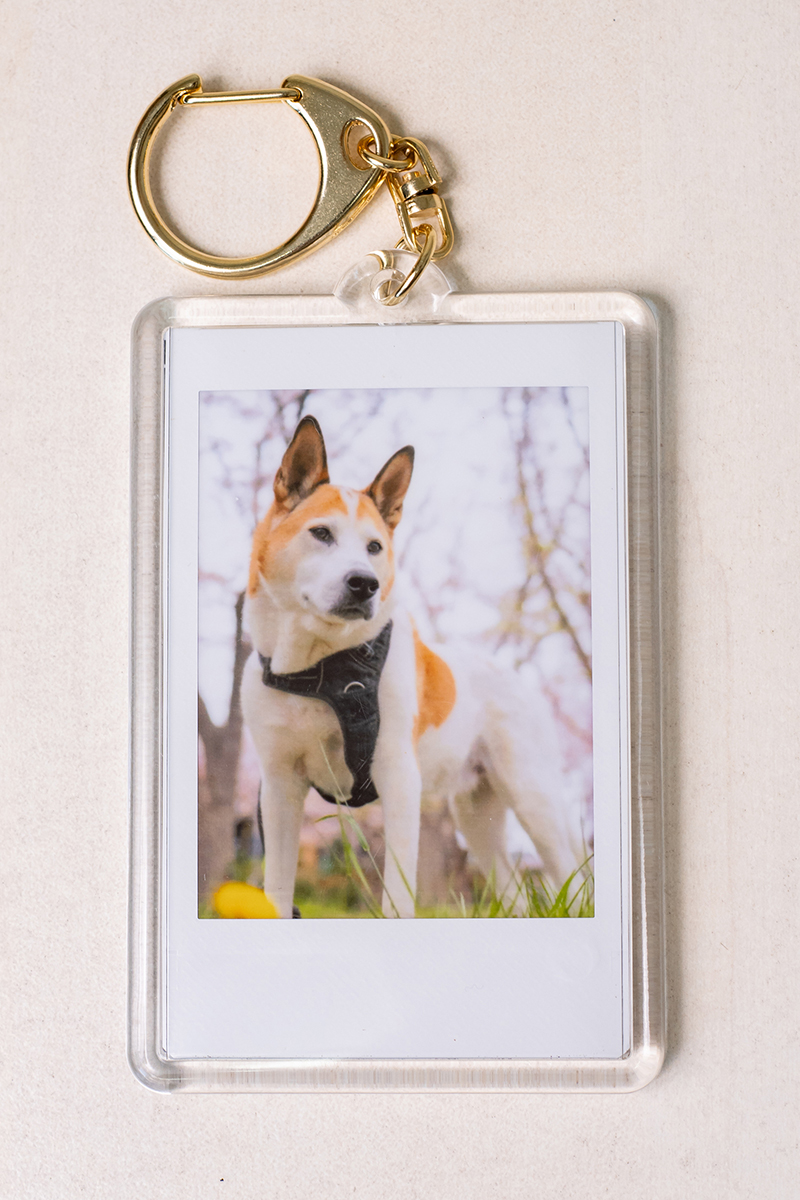 ニコンの別のカメラで撮った写真をスマホに保存して、チェキでプリント→キーホルダーにしてみました。気に入ったので犬の散歩バッグにつけています。