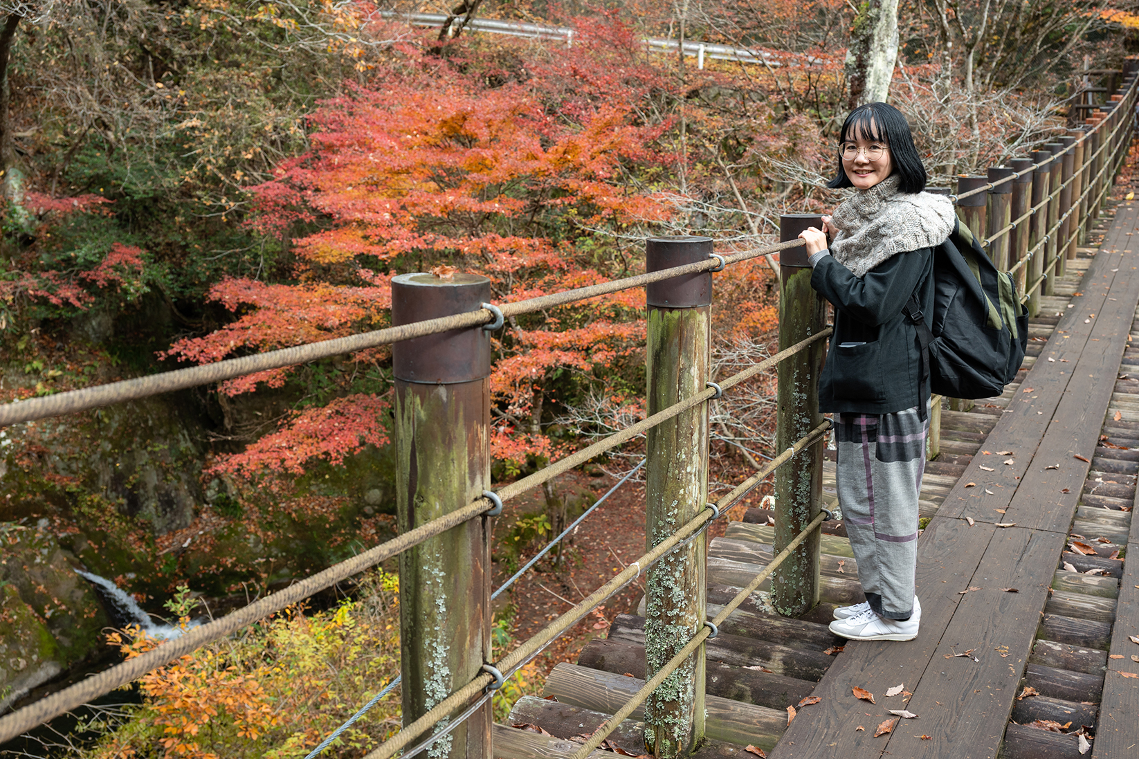川沿いの道を、紅葉を眺めながら静かに歩きます。滝を拝み、吊り橋を渡りました。