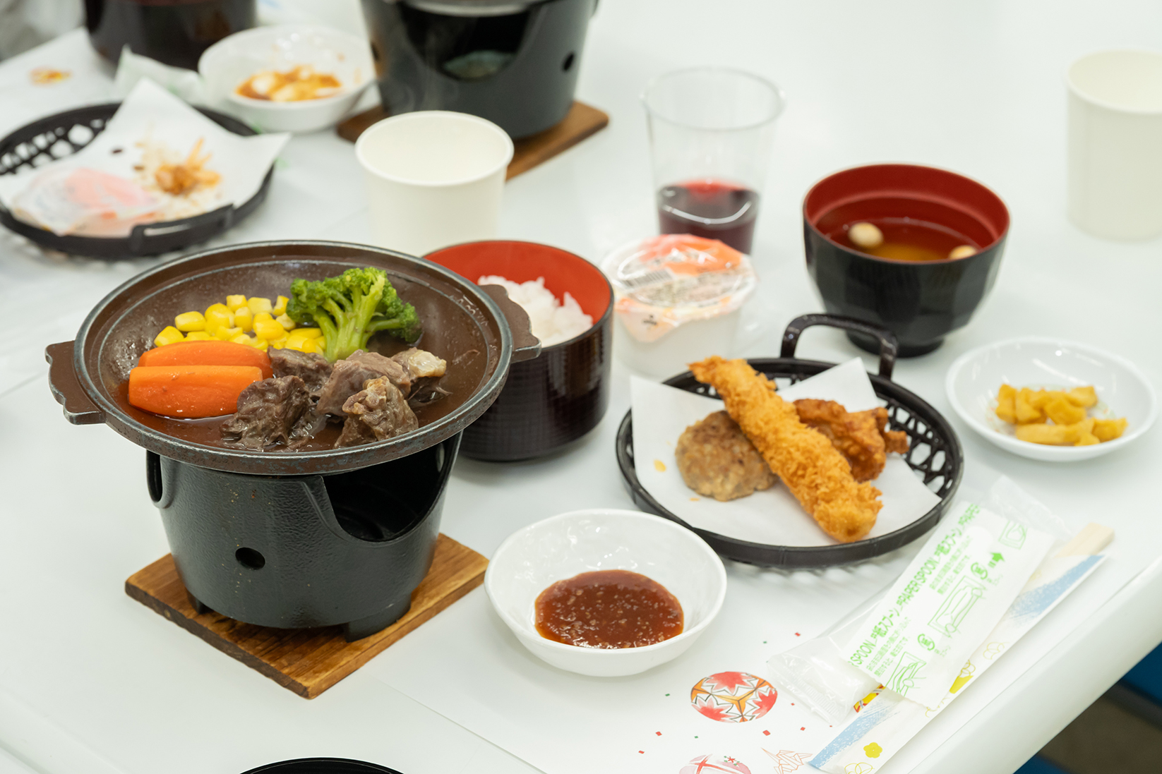 これは道の駅でいただいたサイコロステーキ。こんなに美味しいものを食べられてみんな幸せですね。宿舎のご飯も最高です。